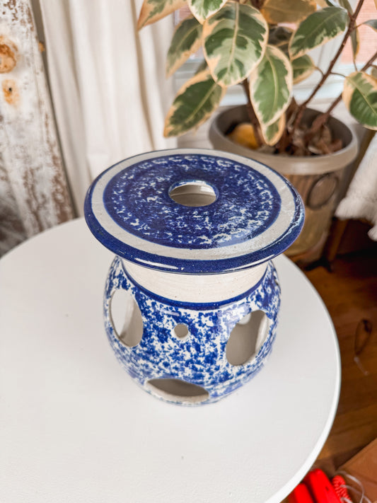 Sponge Glazed Pottery Onion Keeper White & Blue Drip Glaze